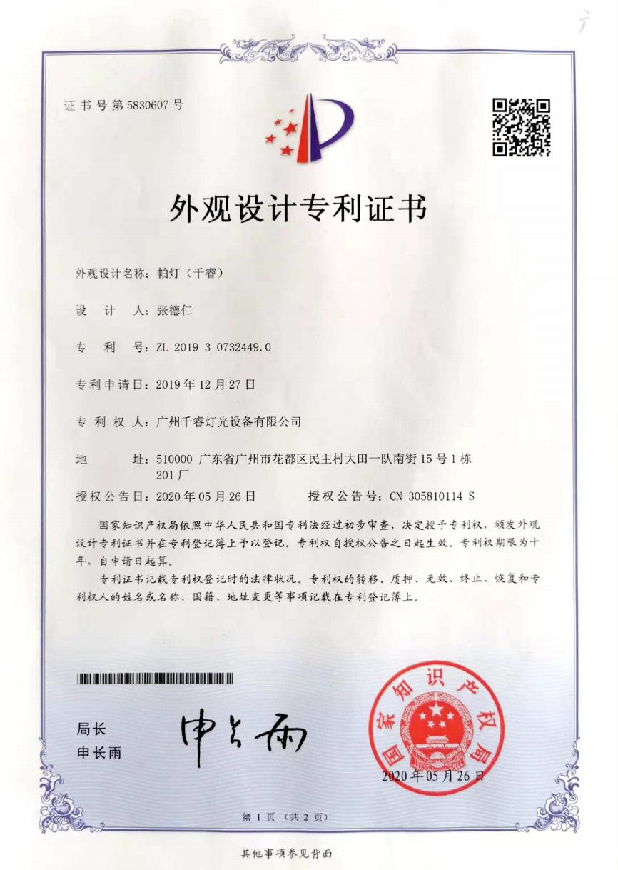 • Utility Model Patent Certificate – Stage Light Rotating Device